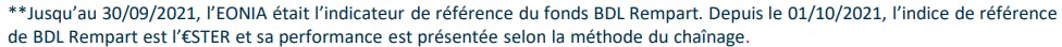 L'indicateur de comparaison de BDL Rempart(€STR capitalisé) est calculé hors dividendes, ce qui peut induire un biais dans la comparaison de la performance.