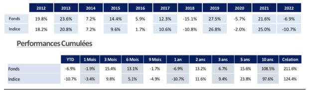 Le fonds BDL Convictions, fonds PEA, dont les encours sont de 1 milliard d’euros, surperforme son indice de référence (Stoxx 600dividendes réinvestis) 12 années sur 15 et prouve ainsi qu’une gestion active peut surperformer sur le long terme les gestions passives. Sa performance 2022est de -6.93% versus son indice de référence à -10.69%. La performance annualisée du fonds depuis sa création en 2008 est de +8.27%. Il s’agit d’un fonds long only éligible au PEA, investissant sur des entreprises européennes. Le portefeuille est concentré puisque composé de 25 à 35 valeurs.