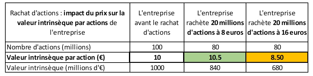 Dans le premier cas, l’entreprise annonce un programme de rachat de 20 millions d’actions (20% de son capital) qu’elle parvient à effectuer sur les marchés à un cours de 8 euros. Elle a donc dépensé 160 millions d’euros (20 x 8 = 160),il lui reste 80 millions d’actions (100 – 20 = 80) et sa valeur est de 840millions d’euros (1000 - 160 = 840). La valeur intrinsèque par action a progressé de 50 centimes à 10.5€.