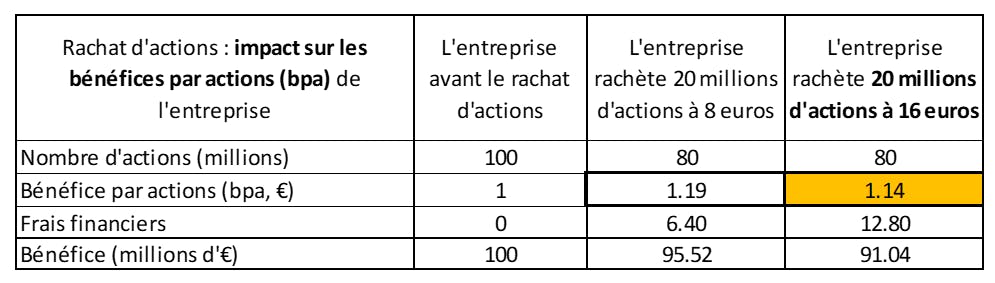 Cependant, s’il est réalisé à un prix trop élevé, le rachat d’actions augmente le bpa sans création de valeur pour l’entreprise. Reprenons le cas de notre entreprise et supposons qu’elle fasse un bénéfice de 100 millions d’euros. Son bpa est donc de 1€. L’entreprise effectue un rachat d’actions à un prix trop élevé de 16euros. Sa valeur intrinsèque par action baisse de 15% à 8,5€ mais son bpa monte de 14% à 1.14€. ** La raison est la suivante : le rachat induit une baisse du nombre d’actions qui est généralement plus avantageuse que l’augmentation des frais financiers qu’il engendre.