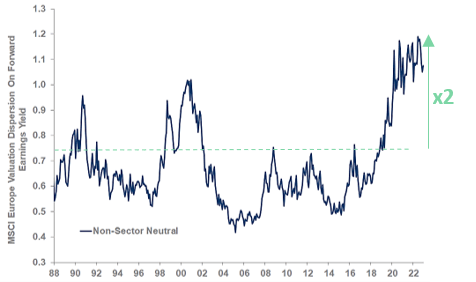 La dispersion des valorisations est proche de son pic historique … Elle est 2x plus élevée que la moyenne historique pour le MSCI Europe !